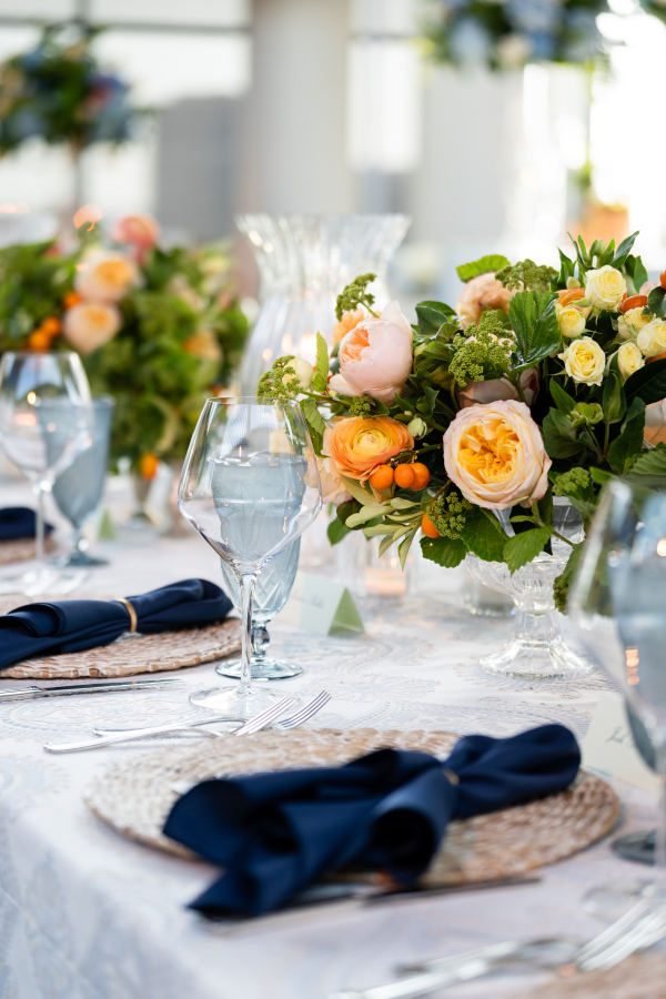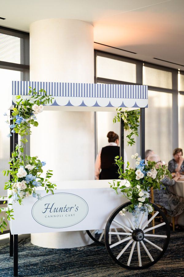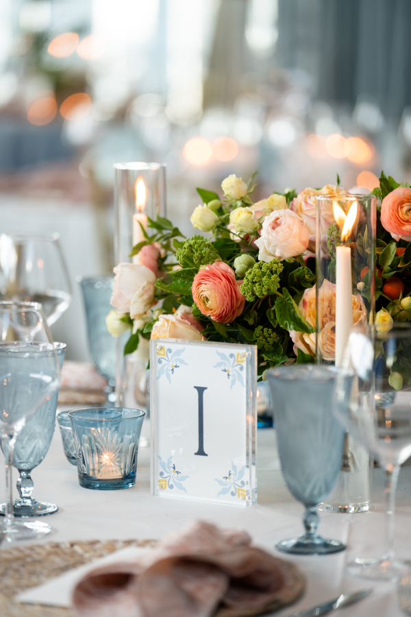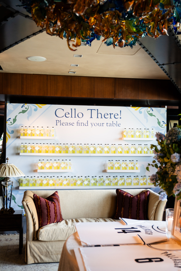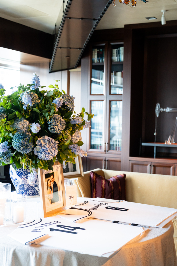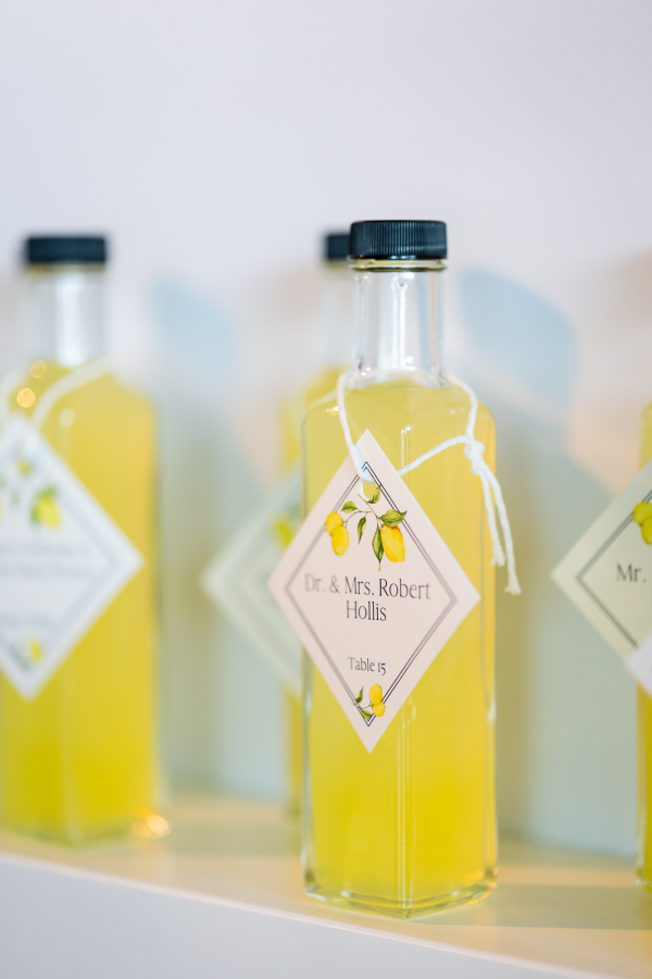 Personal touches were woven throughout the reception design. Guests were greeted by a limoncello seating display, a playful nod to the Mediterranean theme that doubled as an escort card and party favor. The couple’s love of sports made their way into the evening in creative ways, too — like a jersey for guests to sign as the guest book. And, most notably, a basketball-inspired dance floor design.